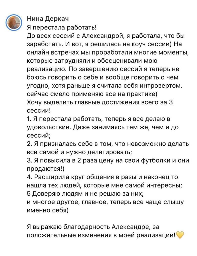 Спустя 1 год после взаимодействия связалась с Ниной, она полностью работает на себя, член сообщества предпринимателей своего города и вышла на желаемый доход